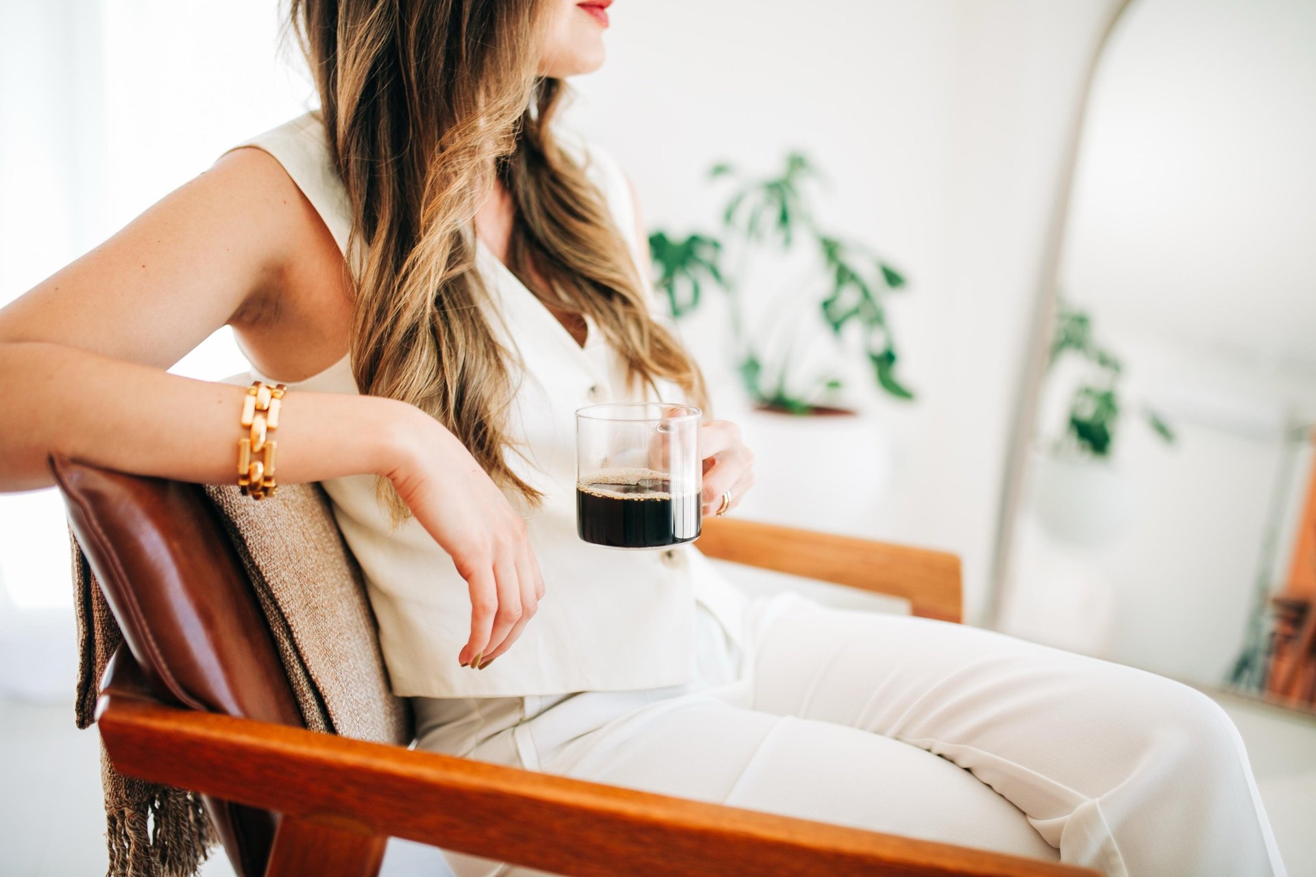 • Móveis orgânicos e modernos, incluindo sofá, poltronas, mesa de reunião e objetos de apoio